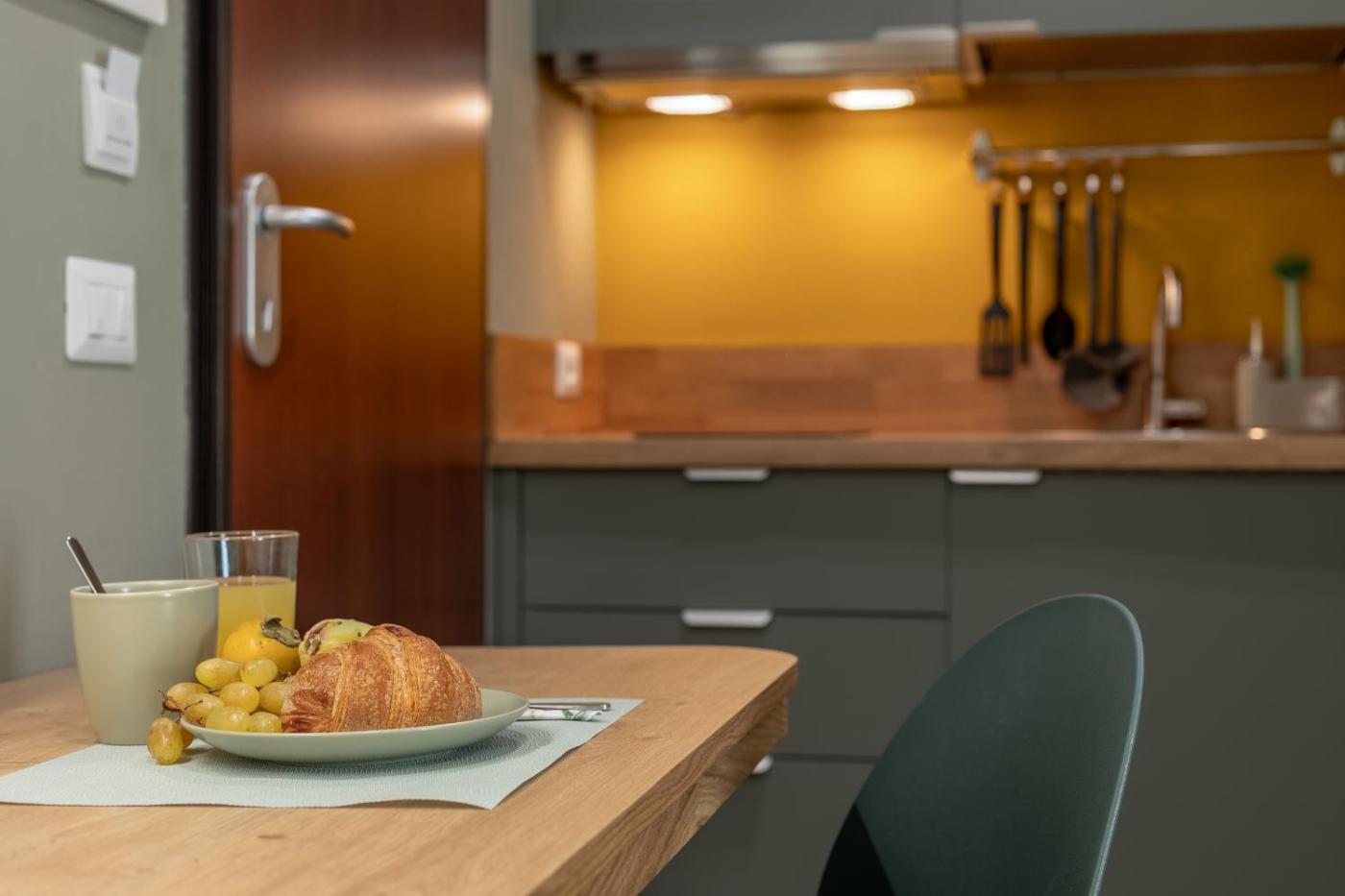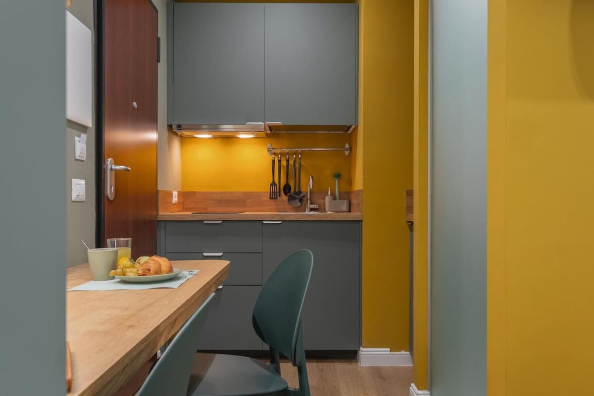 Studio Apartment with One Double Bed. This apartment consists of 1 bedroom, a kitchen and 1 bathroom with a shower and a bidet. The well-fitted kitchen features a stovetop, a refrigerator and a microwave. The apartment provides a tea and coffee maker, a dining area, a wardrobe, heating and a flat-screen TV with streaming services. The unit offers 1 bed.