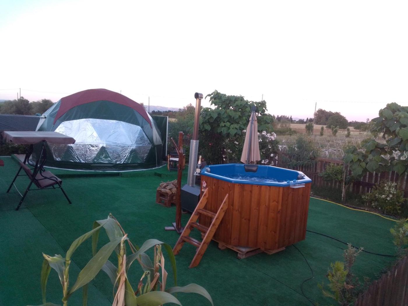 Tent. This tents standout features are the private pool and hot tub. Offering bathrobes, this tent includes a private bathroom with a bath or a shower and a hairdryer. The air-conditioned tent offers a flat-screen TV with satellite channels, a washing machine, a private entrance, a minibar as well as garden views. The unit has 1 bed.